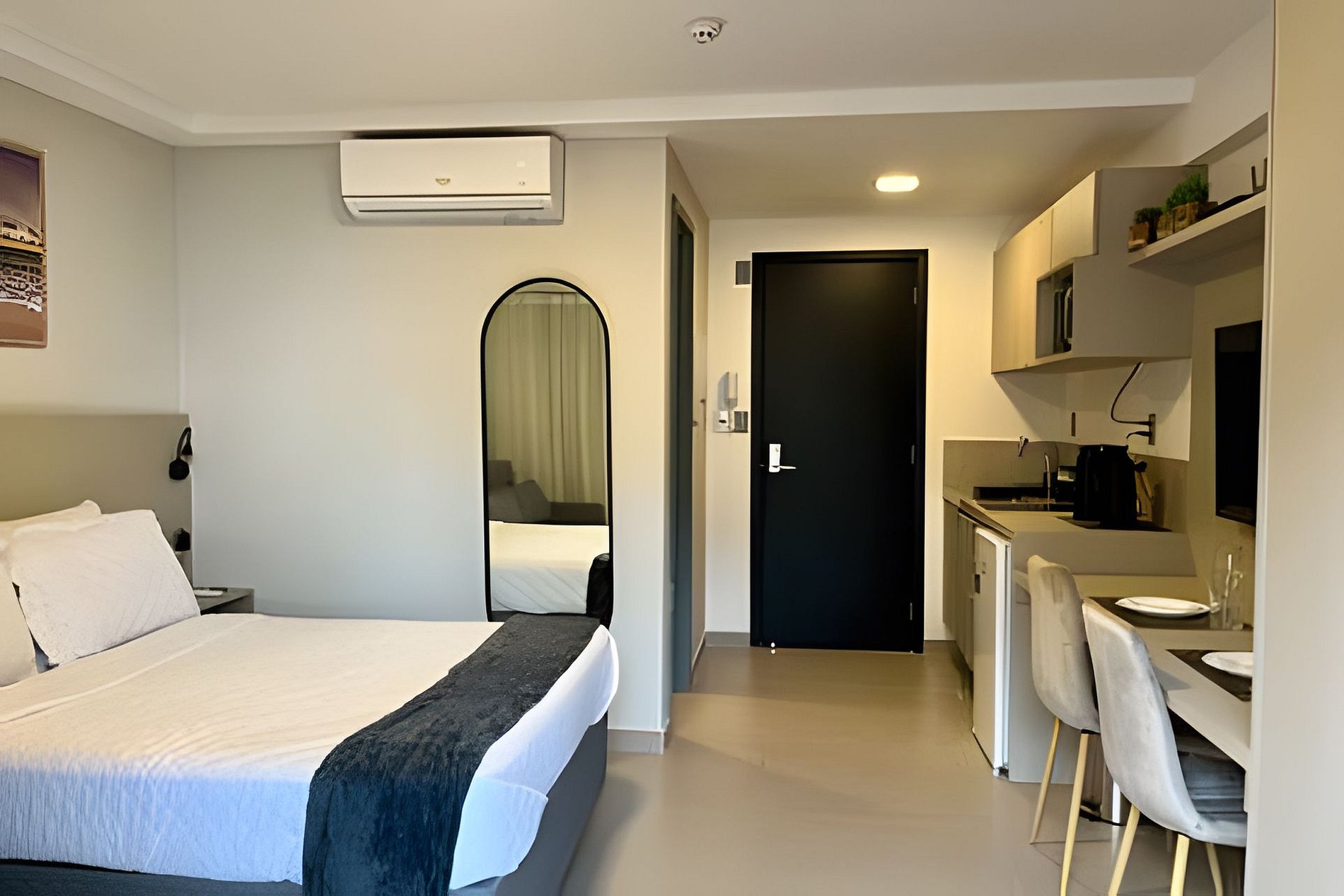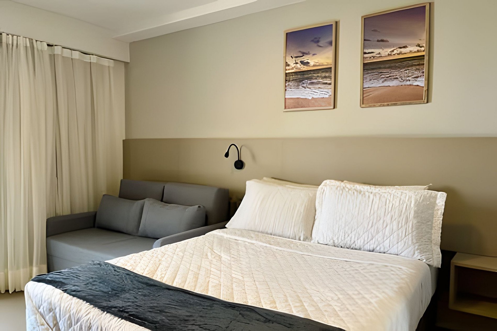 - Quarto com cama casal e 1 sofá cama casal, SmarTV, Ar-condicionado, Guarda-roupa e Mesa com 2 lugares;