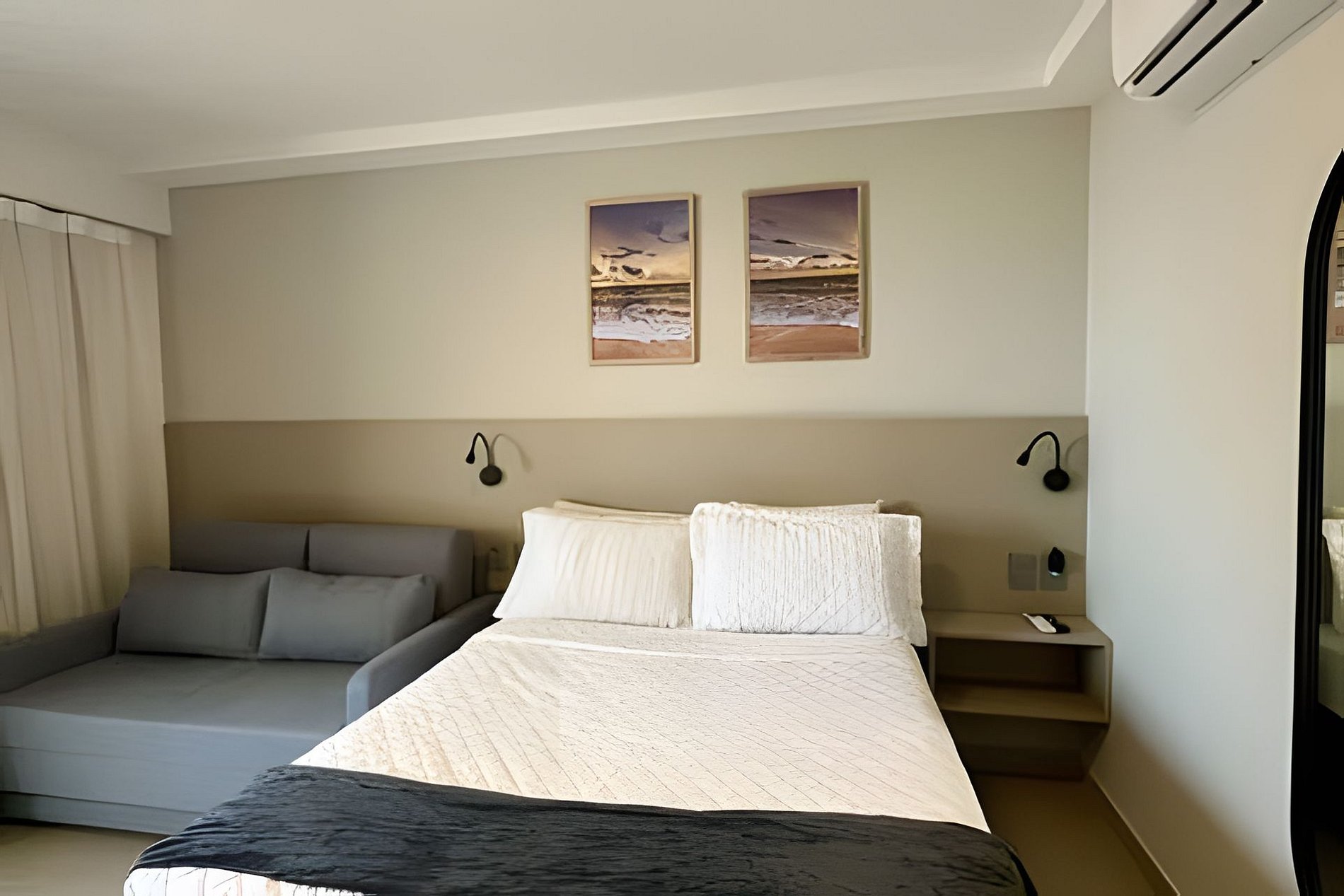 - Quarto com cama casal e 1 sofá cama casal, SmarTV, Ar-condicionado, Guarda-roupa e Mesa com 2 lugares;