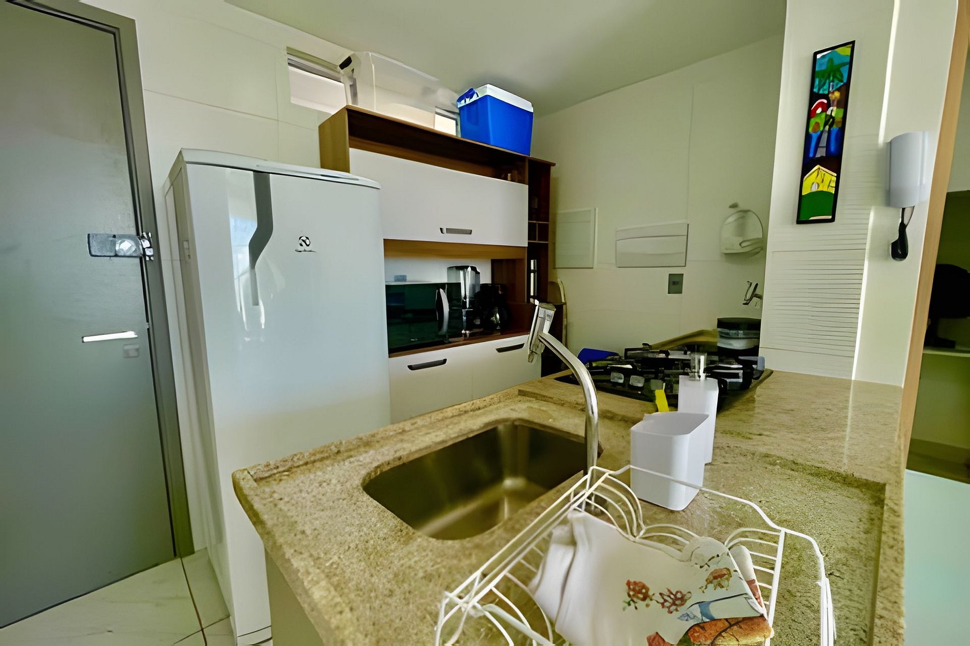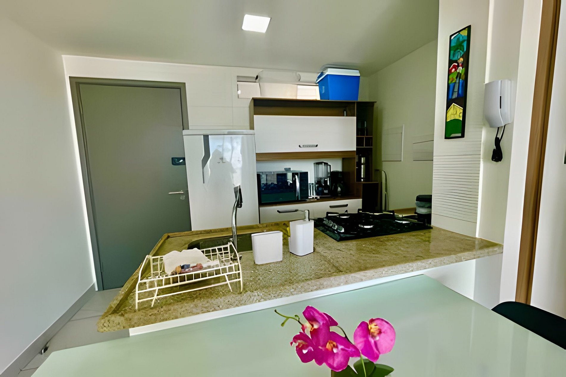 - Cozinha completa com microondas, cooktop, frigobar, cafeteira, sanduicheira. Além de utensílios domésticos como pratos, copos, talheres, jogo de panelas básico e itens de cozinha como açúcar, café e sal; (No item comodidade não dispomos de óleo, tigelas, vasilhas, pimenta e Hashi).