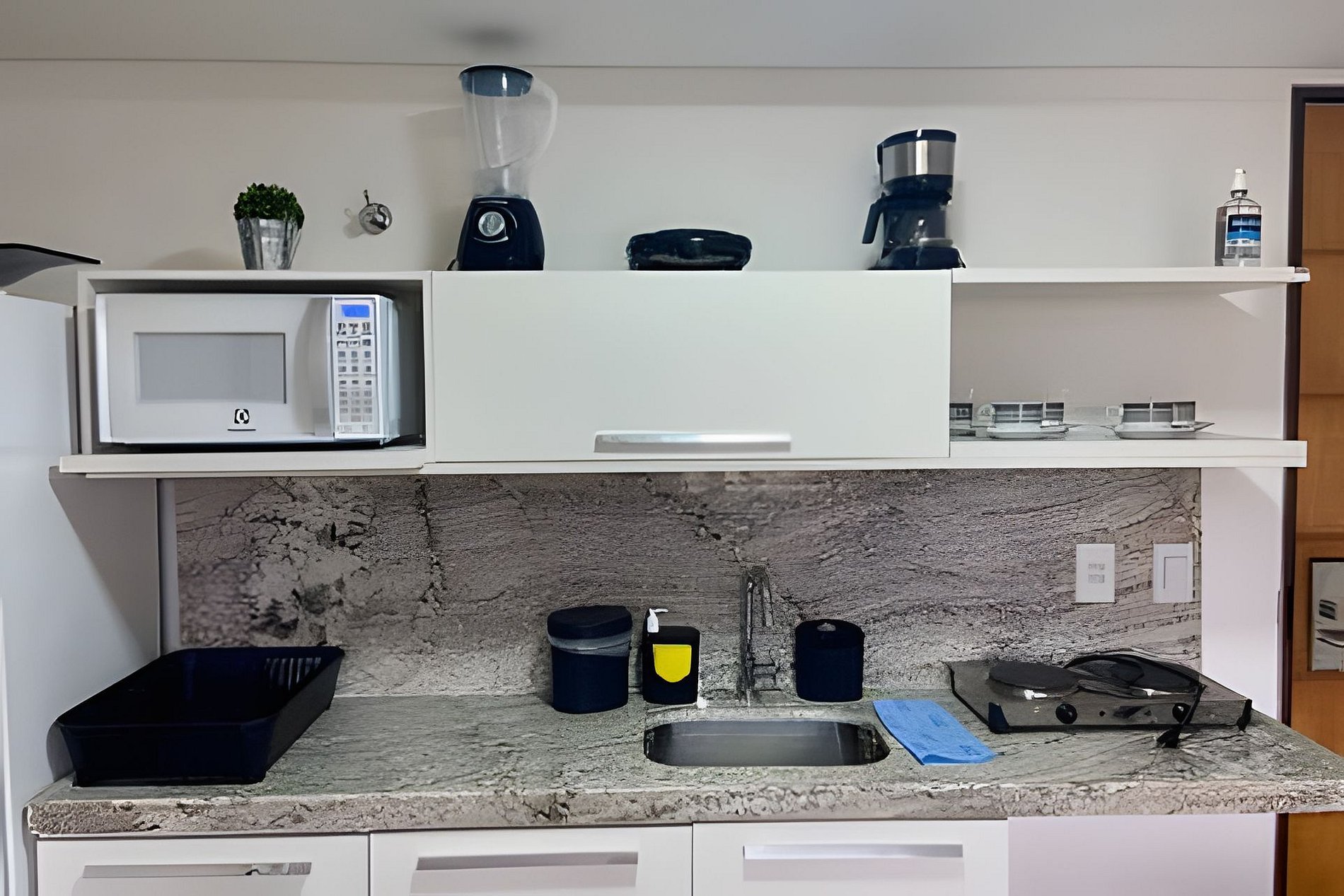 - Cozinha completa com Microondas, Geladeira, Liquidificador, Sanduicheira e Cafeteira. Além de utensílios domésticos como pratos, copos, xícaras, talheres, jogo de panelas básico; (No item comodidade não dispomos de óleo, tigelas, vasilhas, pimenta e Hashi).