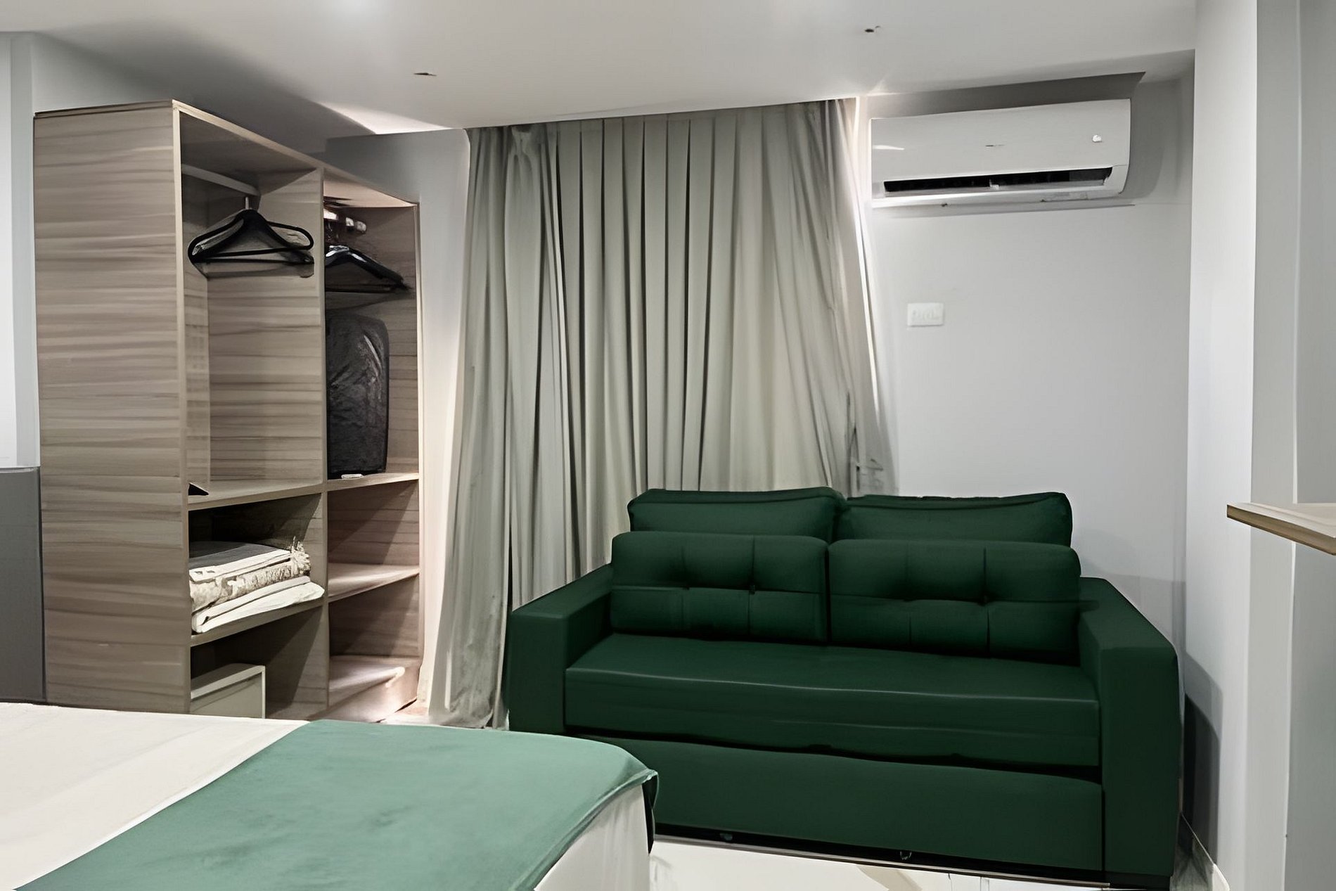 - Quarto com cama casal e 1 sofá cama casal, SmartTV, Ar condicionado e Espaço para guardar roupas;