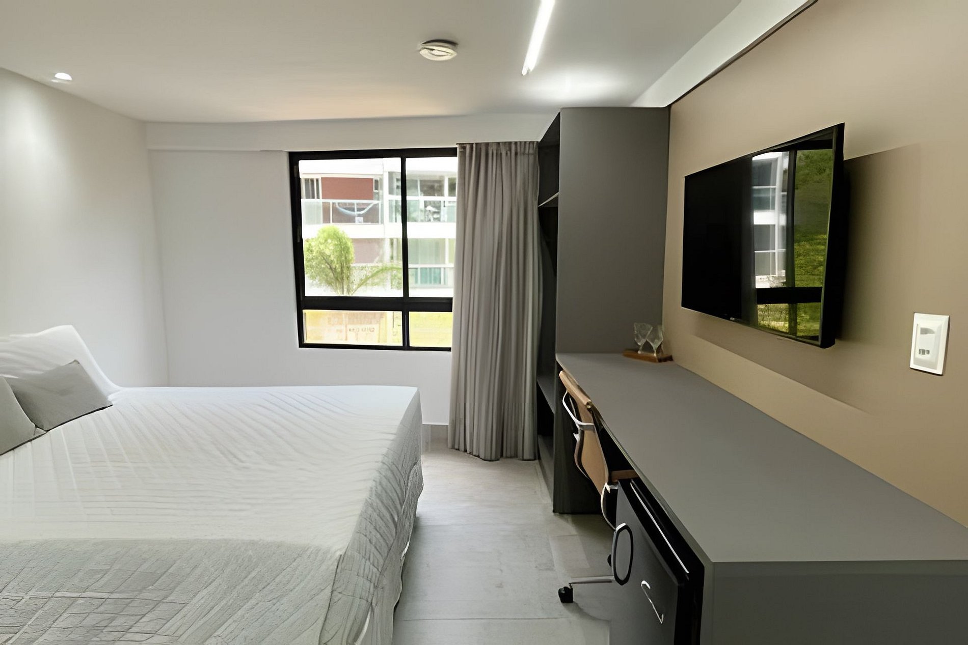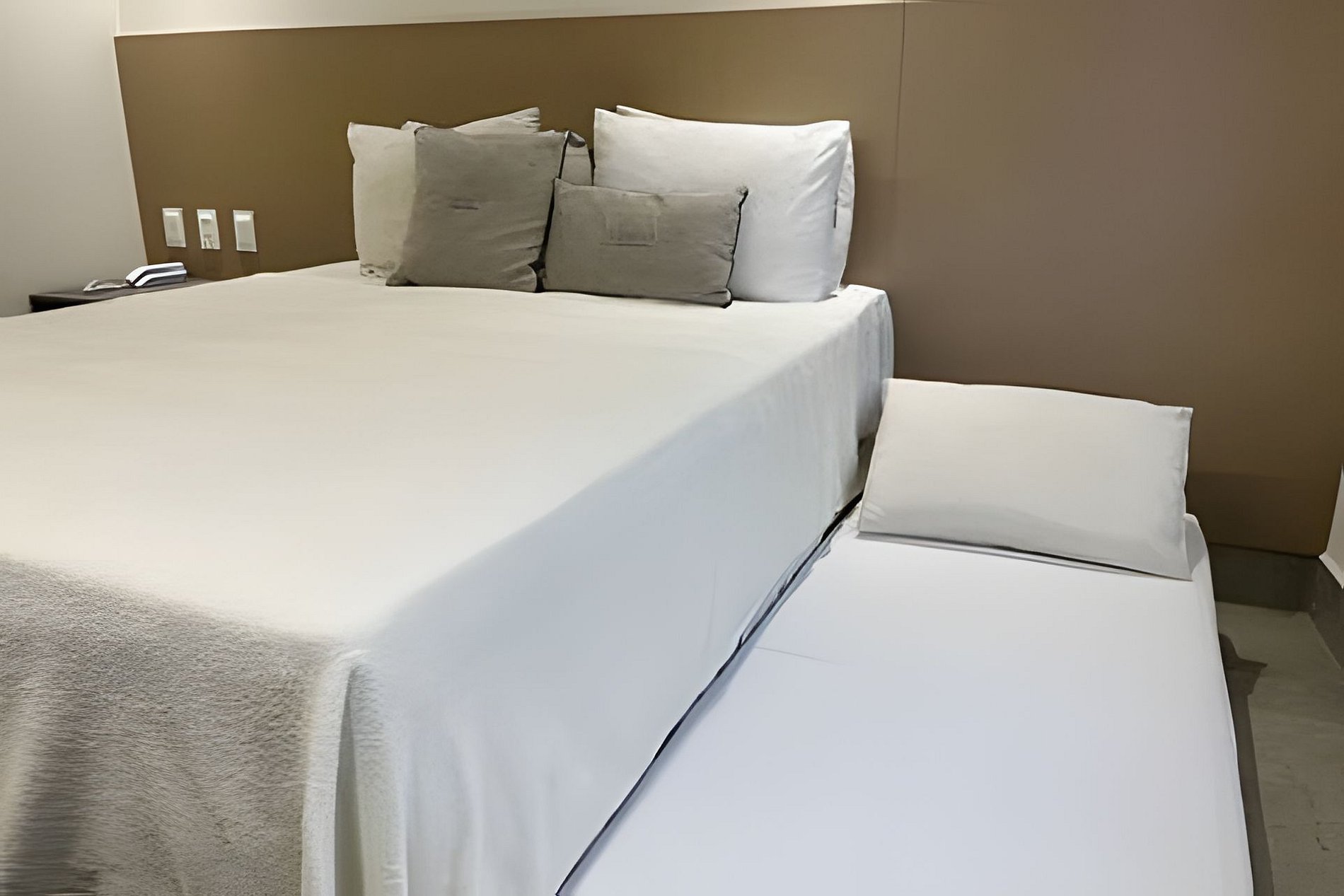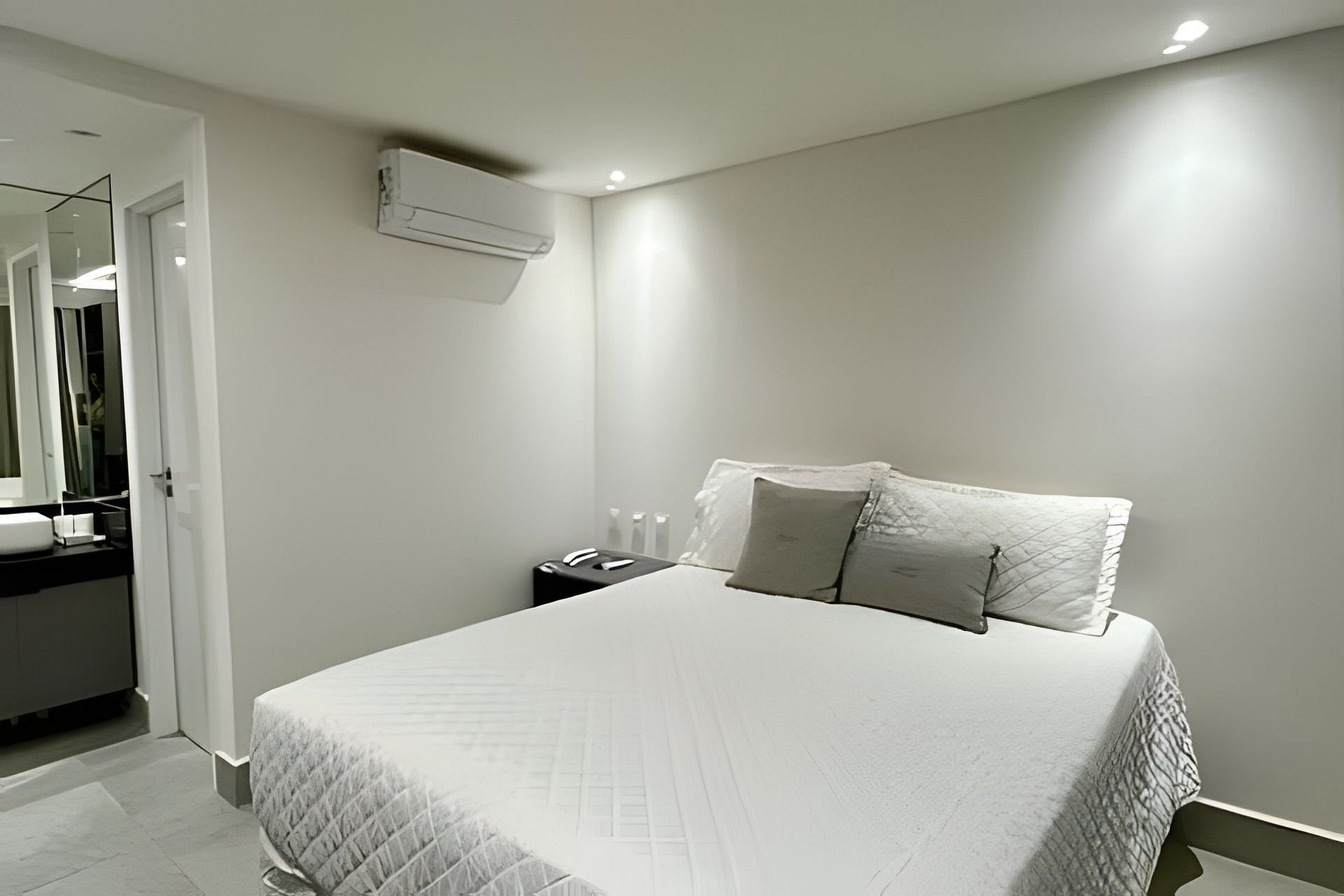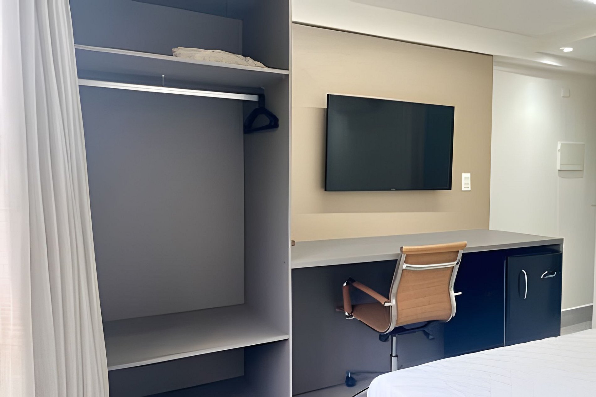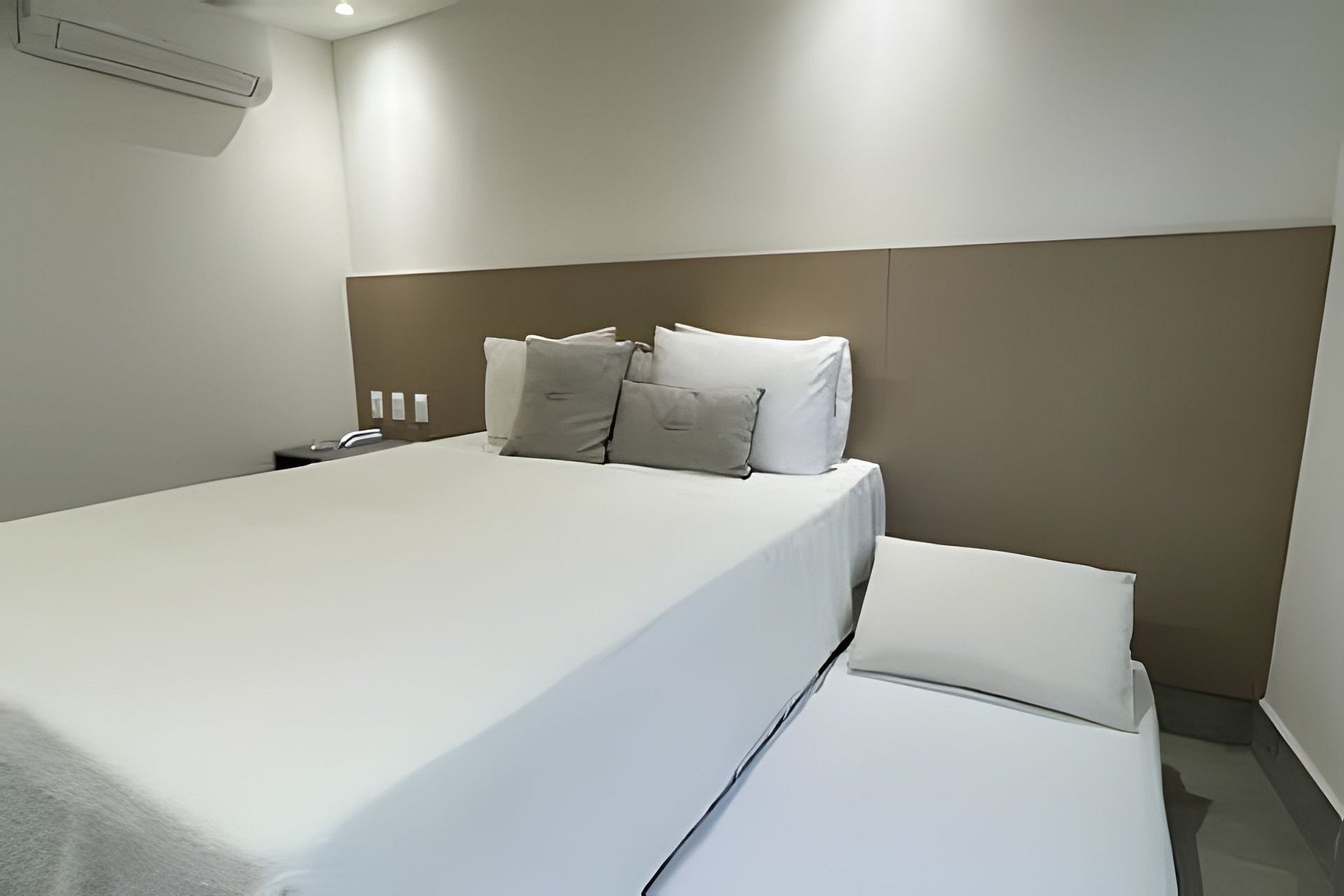 - Quarto com cama Queen com 1 cama de solteiro acoplada, SmarTV, Espaço para guardar roupas e Ar condicionado;