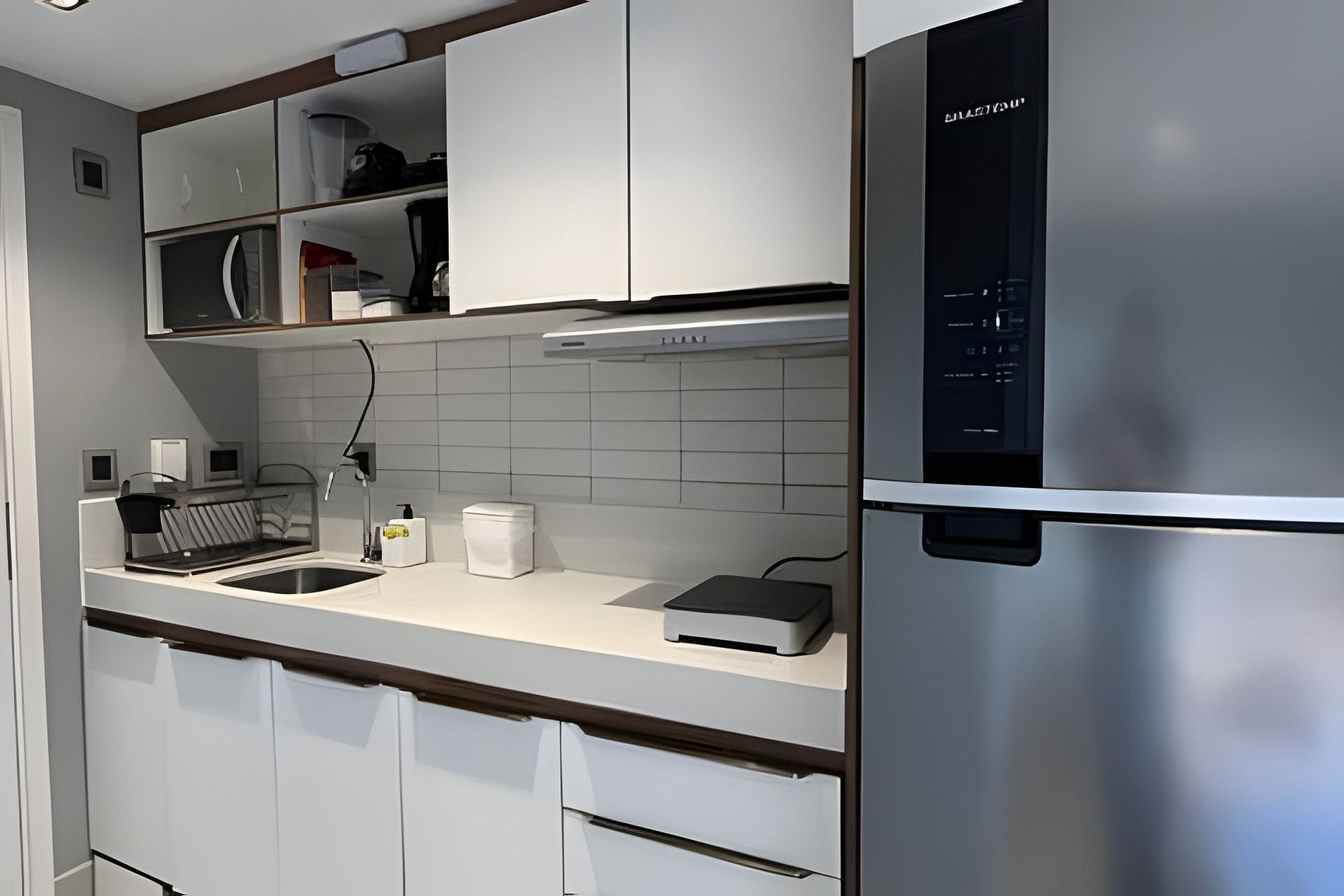 - Cozinha completa com Geladeira, Microondas, Cooktop, Cafeteira, Liquidificador e Sanduicheira. Além de utensílios domésticos como pratos, copos, xícaras, talheres, jogo de panelas básico; (No item comodidade não dispomos de óleo, tigelas, vasilhas, pimenta e Hashi).