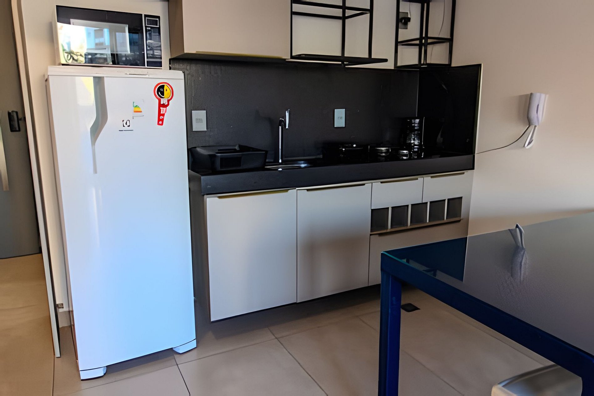 - Cozinha completa com microondas, cooktop, geladeira, sanduicheira. Além de utensílios domésticos como pratos, copos, xícaras, talheres e jogo de panelas básico; (No item comodidade não dispomos de óleo, tigelas, vasilhas, pimenta e Hashi).