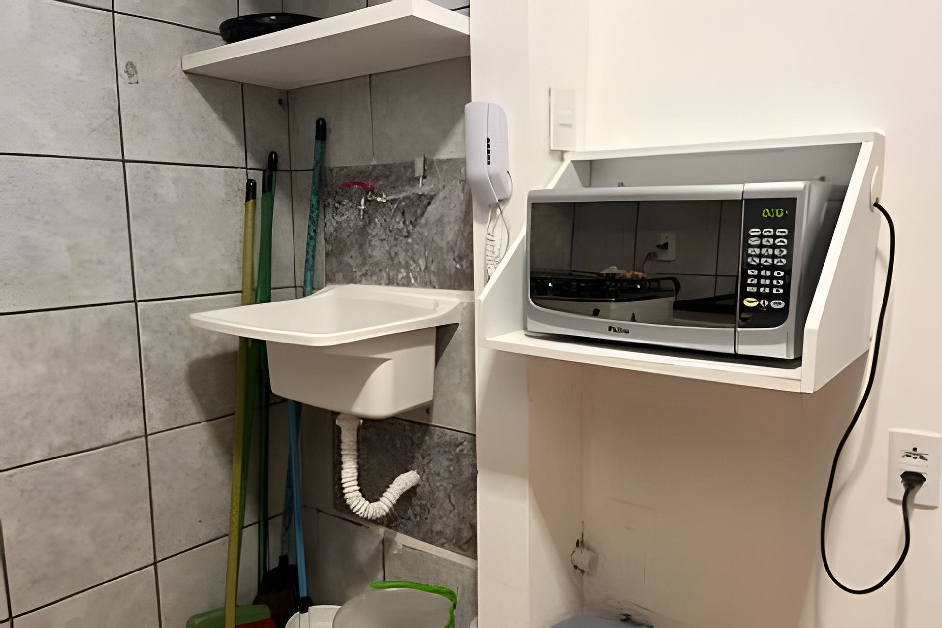 - Cozinha completa com Geladeira, Fogão, Micro-ondas, Cafeteira, Liquidificador e Sanduicheira. Além de utensílios domésticos como pratos, copos, xícaras, talheres, jogo de panelas e itens de cozinha como açúcar, café e sal; (No item comodidade não dispomos de óleo, tigelas, vasilhas, pimenta e Hashi).