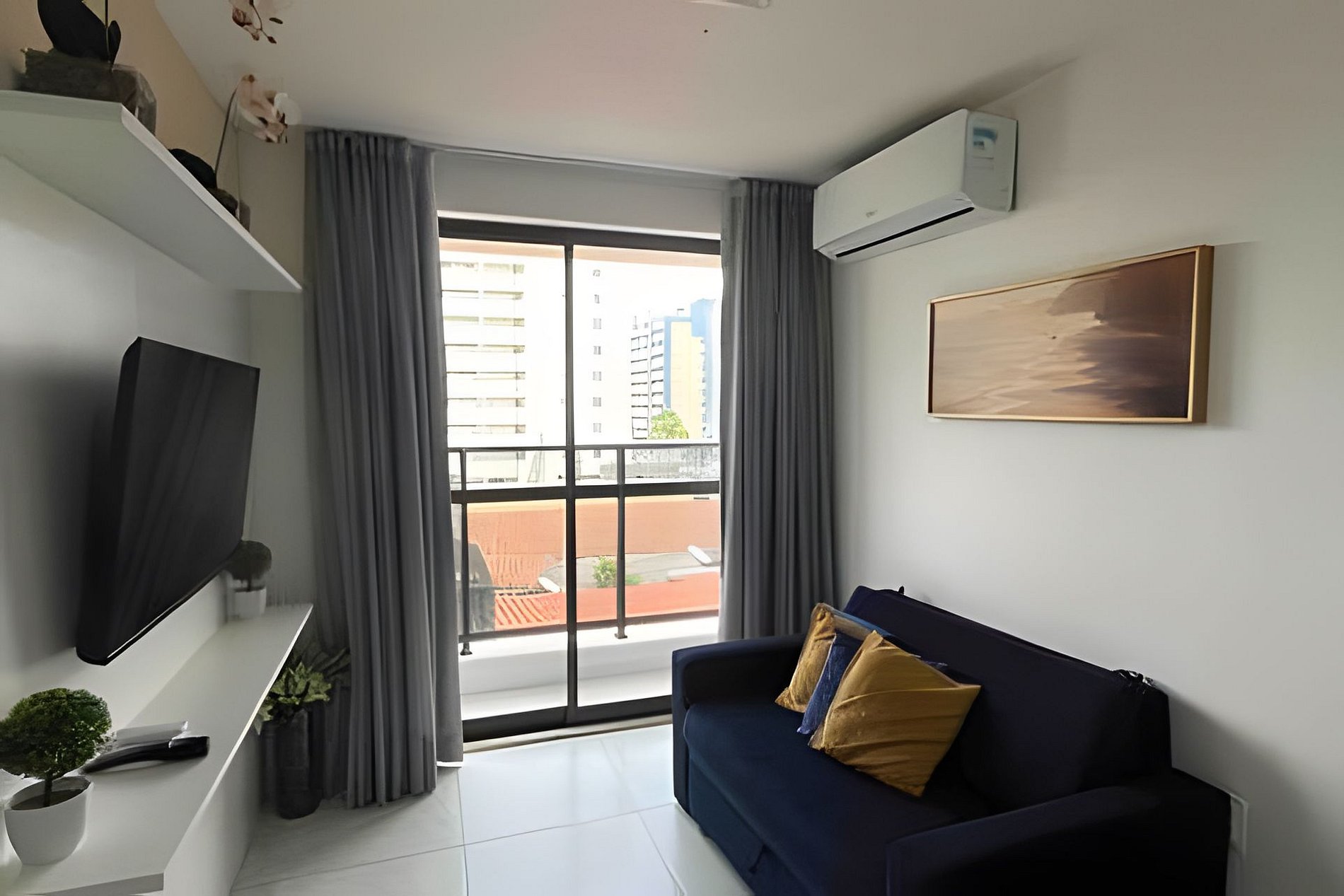 - Sala com sofá cama casal, SmarTV e Ar-condicionado 18mil btus na sala (com vasão para o quarto de casal);