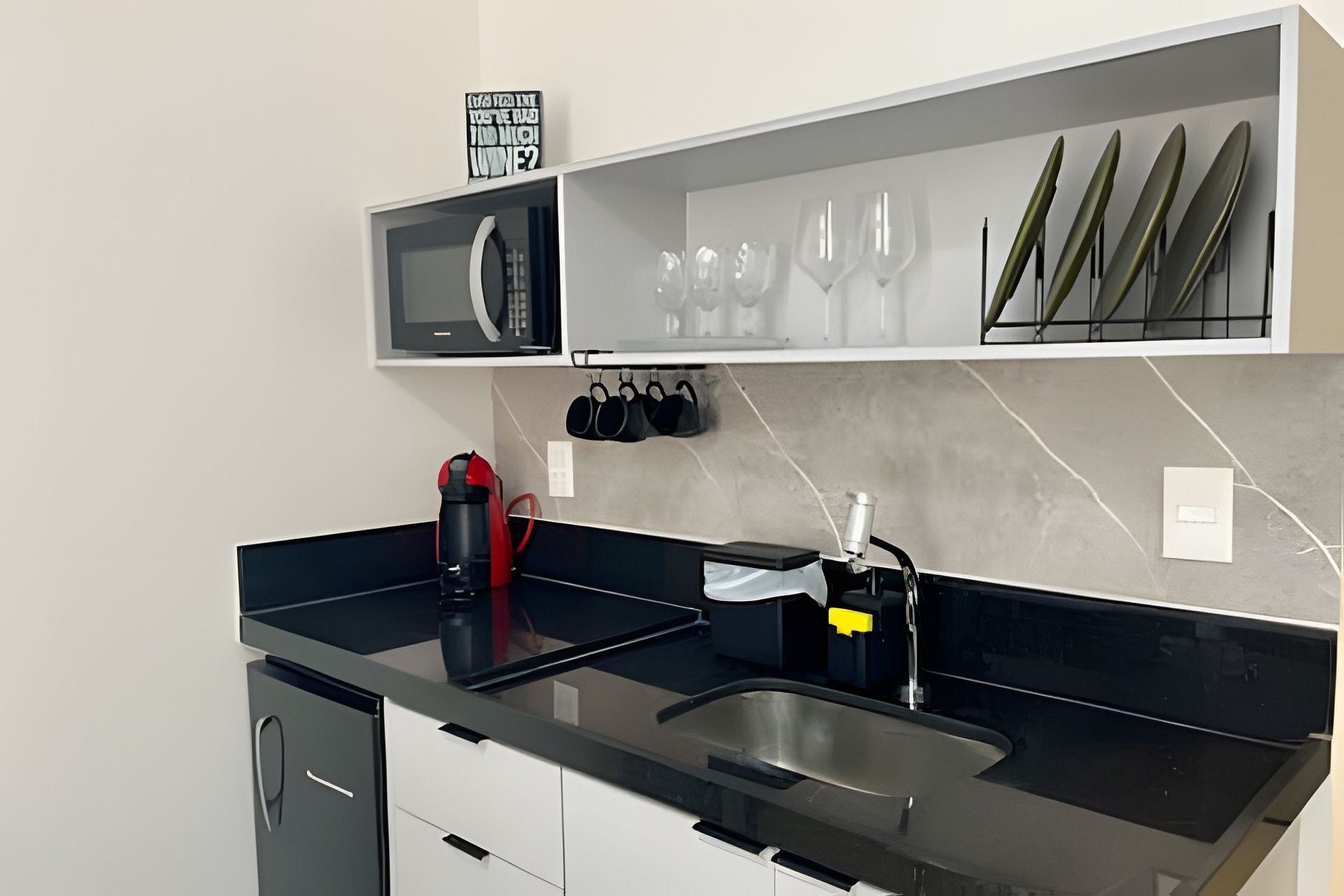 - Cozinha completa com Frigobar, Micro-ondas, Fogão de indução (1 Boca), Cafeteira (cápsulas por conta do hóspede) e Sanduicheira. Além de utensílios domésticos como pratos, copos, xícaras, taças, talheres e jogo de panelas básico. (No item comodidade não dispomos de óleo, tigelas, vasilhas, pimenta e Hashi).