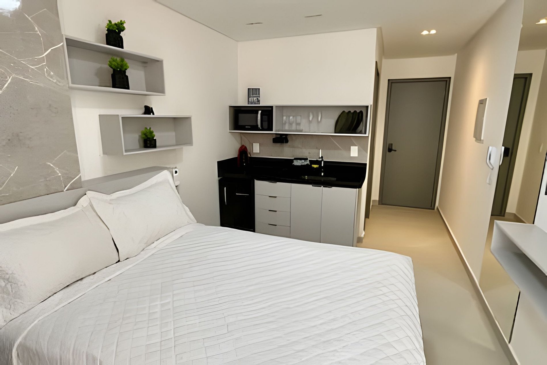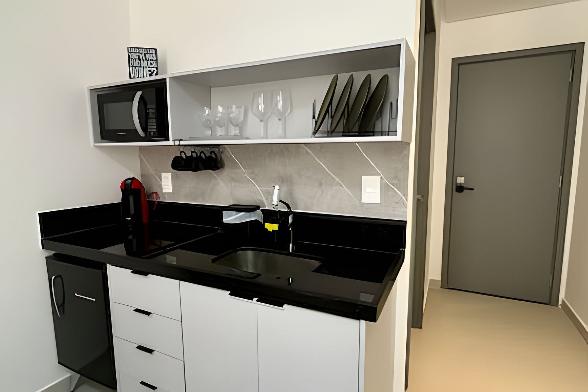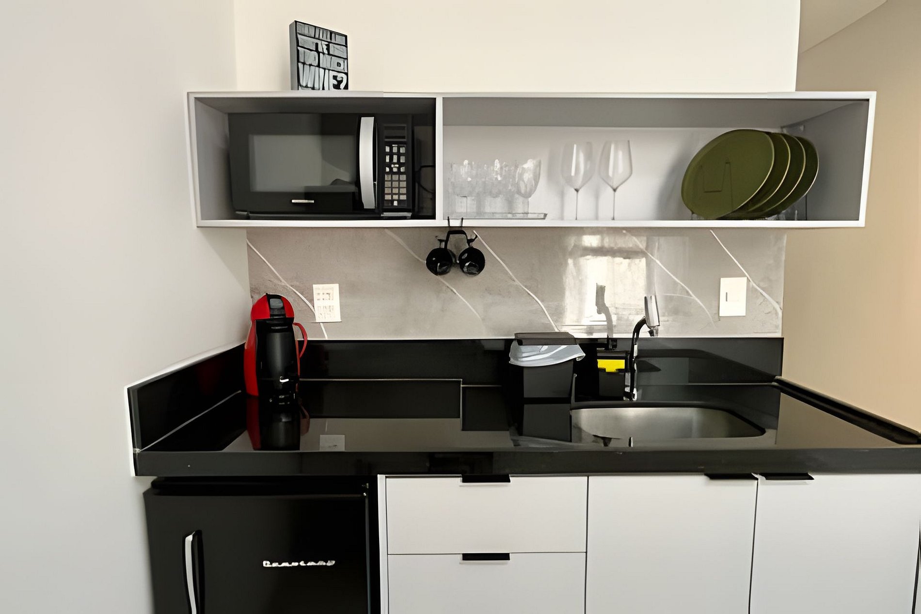 - Cozinha completa com Frigobar, Micro-ondas, Fogão de indução (1 Boca), Cafeteira (cápsulas por conta do hóspede) e Sanduicheira. Além de utensílios domésticos como pratos, copos, xícaras, taças, talheres e jogo de panelas básico. (No item comodidade não dispomos de óleo, tigelas, vasilhas, pimenta e Hashi).