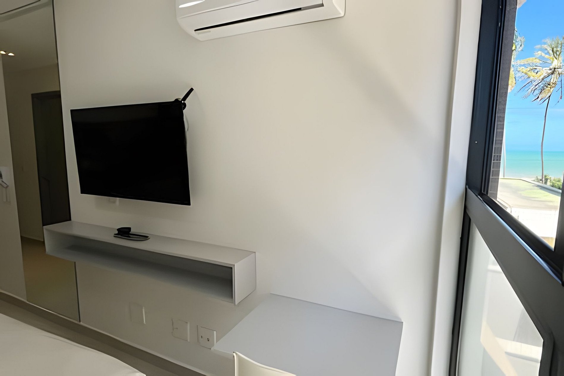 - Quarto com cama casal e cama de solteiro acoplada, Guarda-Roupa, SmarTV, Ar condicionado e janelão com vista mar;