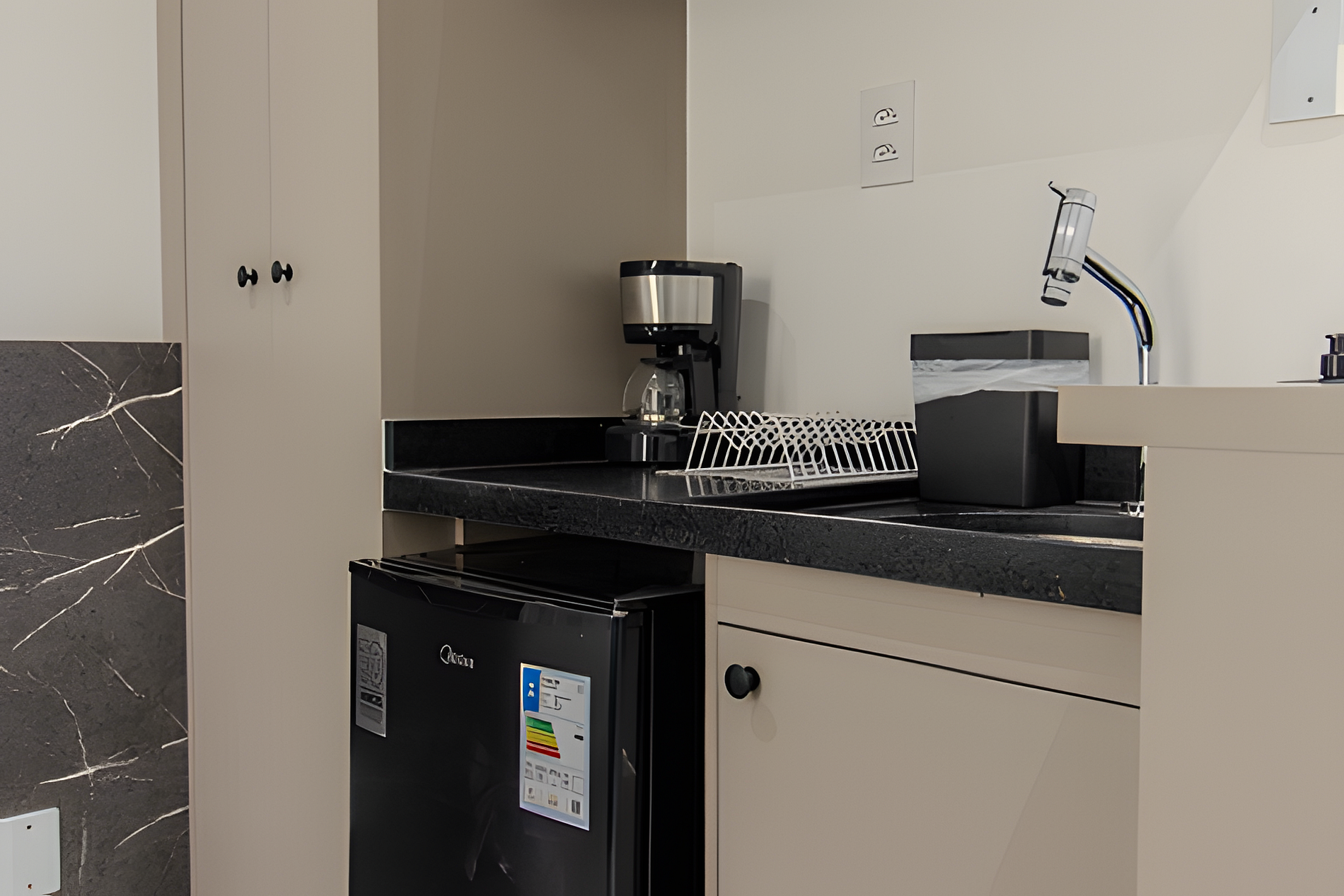 - Cozinha completa com Frigobar, Micro-ondas, Cafeteira e Sanduicheira. Além de utensílios domésticos como copos, xícaras, taças, pratos e talheres. (No item comodidade não dispomos de óleo, tigelas, vasilhas, pimenta e Hashi).