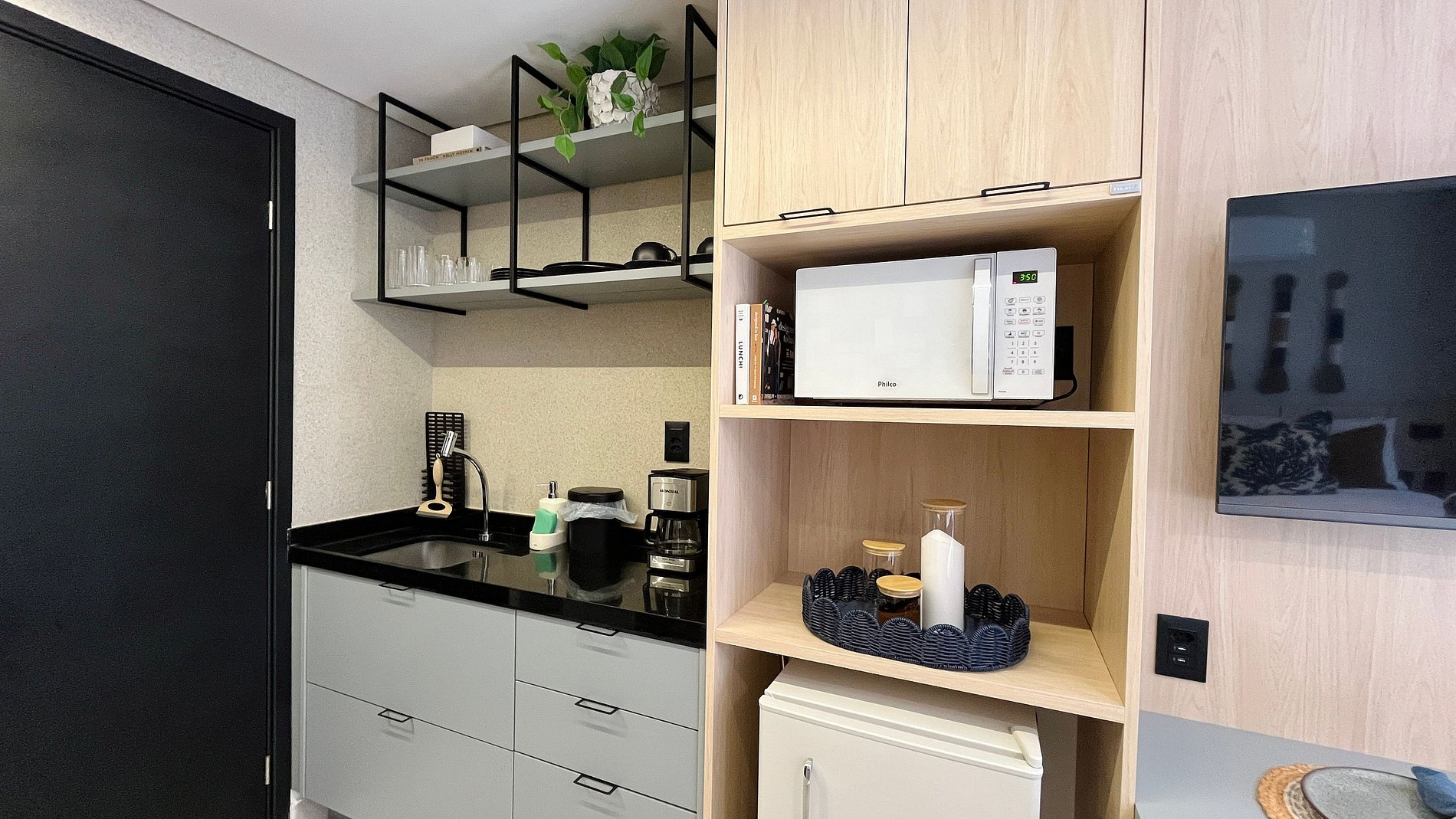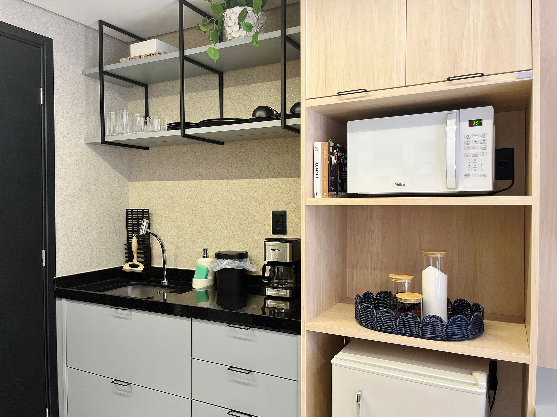 - Utensílios básicos (copos, xícaras, taças, pratos, talheres, jogo de panelas básico e utensílios de cozinha)
